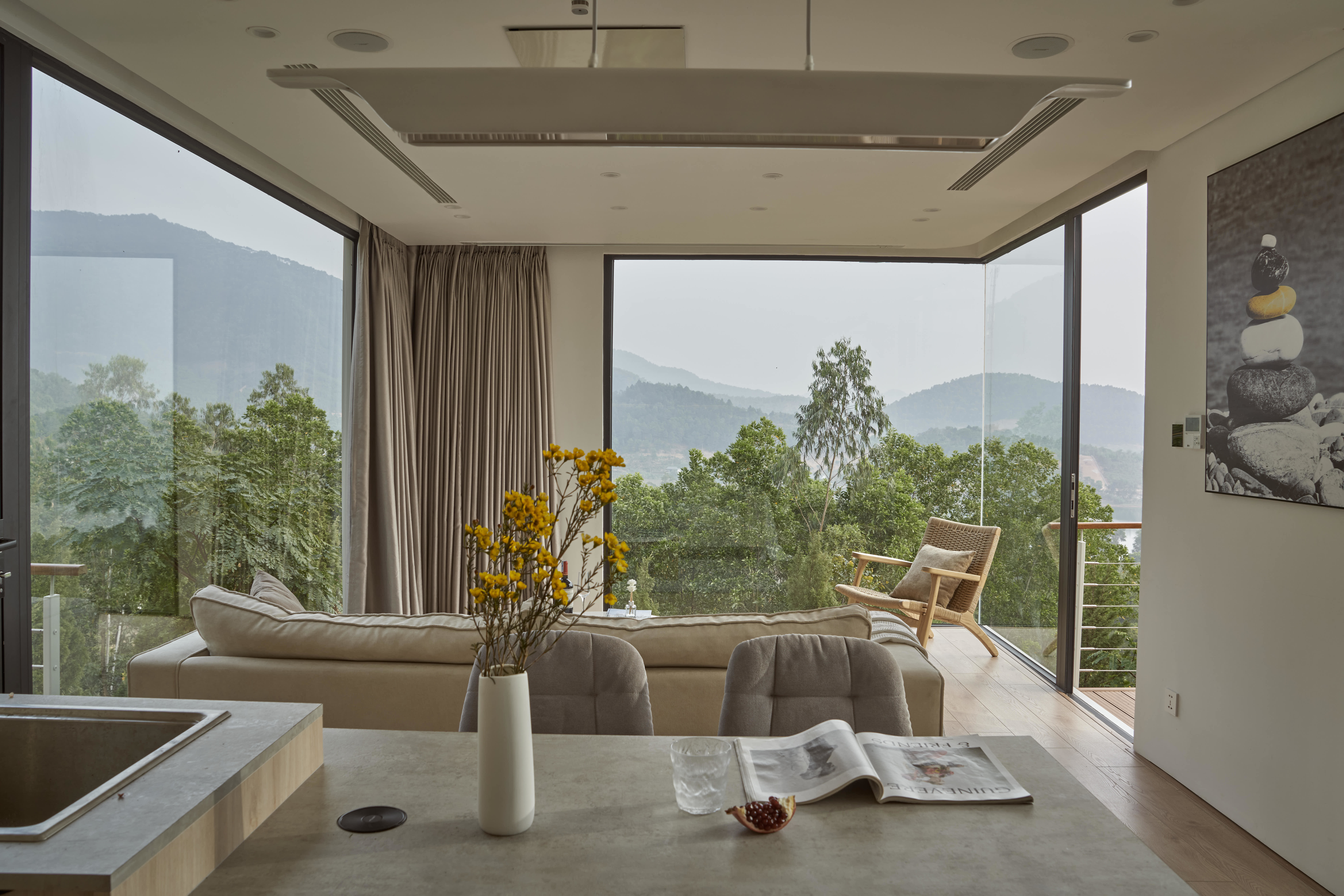 Căn nhà có phòng khách nối liền bếp, phòng ngủ, phòng làm việc và nhà vệ sinh. Tất cả các phòng đều có hệ cửa kính lớn để gia chủ dễ dàng ngắm trọn khung cảnh thiên nhiên nên thơ