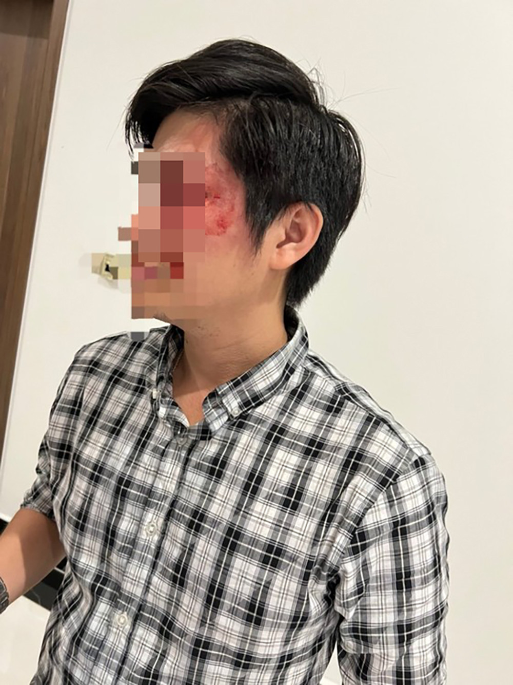 Người cha bảo vệ con trước con chó bị anh Đào Thế Vinh (28 tuổi, ngụ cùng chung cư) đánh bị thương với chẩn đoán bước đầu: Vết thương mí mắt trái, chấn thương mặt, mắt trái, gò má trái, phần mềm ngực trái, vỡ mảnh 1x2 milimet răng cửa hàm dưới trái.