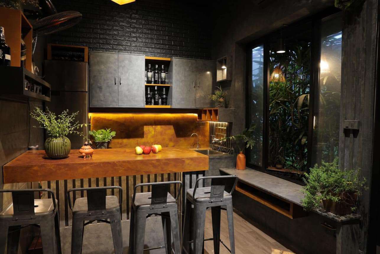 Phòng khách có cửa kính lớn để ngắm "vườn treo" 40m2. Bạn bè tới chơi nhà có thể vừa ngồi uống cà phê ở phòng khách vừa ngắm vườn hoặc khi đẹp trời, họ tổ chức tiệc nướng BBQ ngoài vườn. Phòng bếp cũng được cải tạo, lắp hệ cửa kính mở ra một góc vườn phụ trồng trúc xanh mướt.