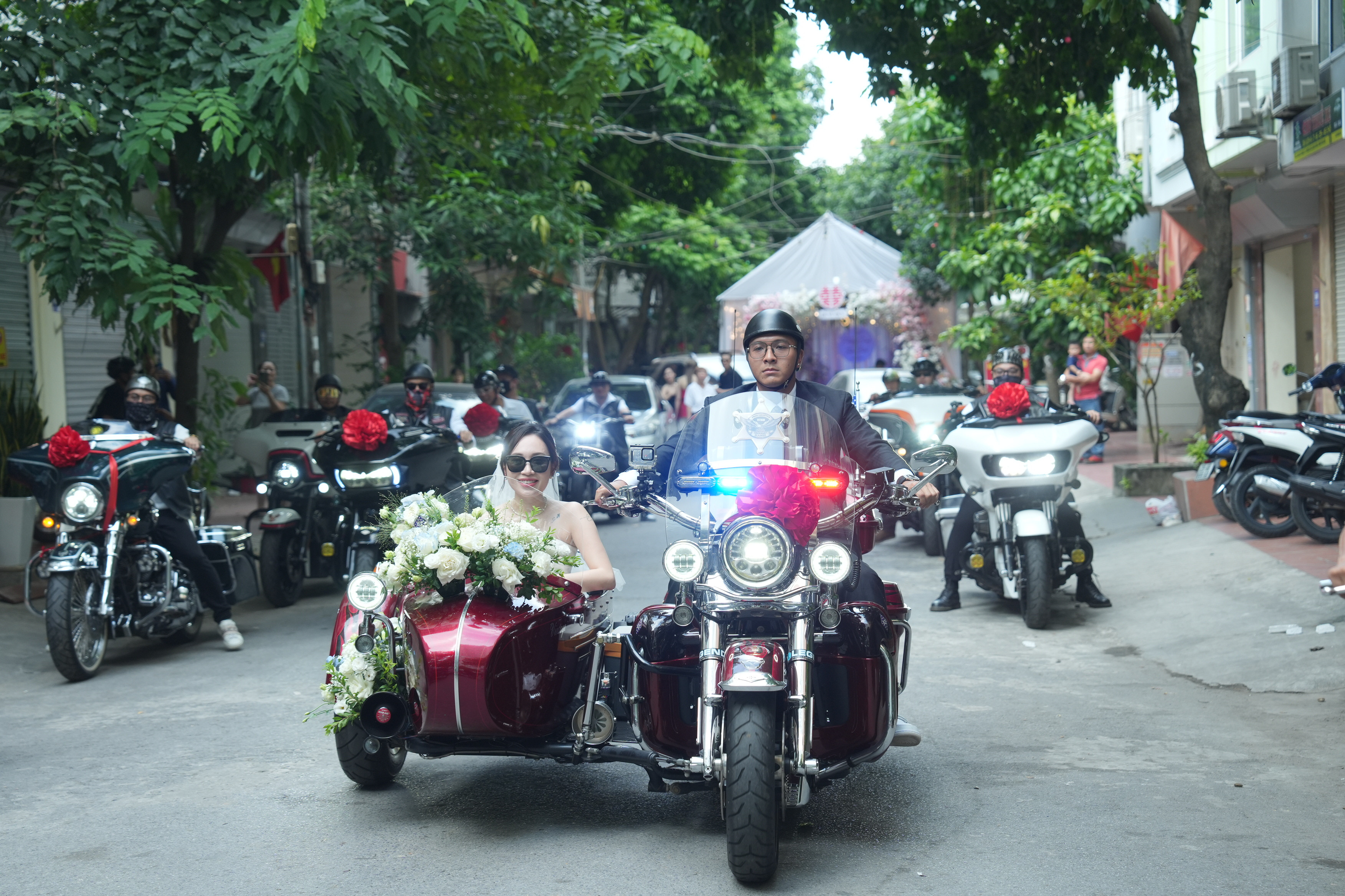 30 chiếc mô tô phân khối lớn được trang trí hoa cưới đỏ rực rỡ đi qua các tuyến phố. Xuất phát từ Gia Lâm, qua cầu Vĩnh Tuy tới nhà gái tại Hà Đông (Hà Nội), đoàn xe khiến không ít người đi đường trầm trồ