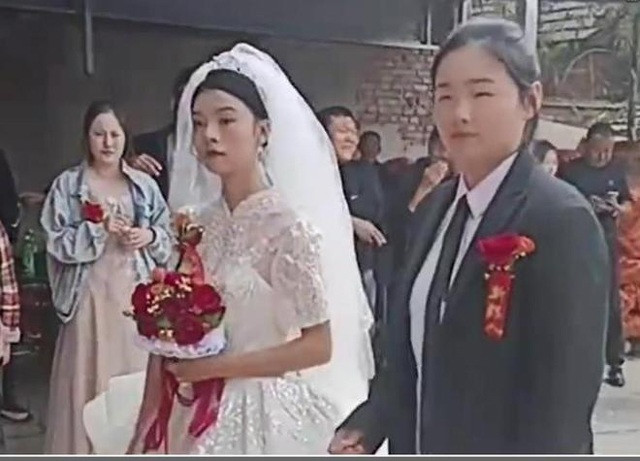 Sau đó, cô em gái mặc trang phục vest đen, cài hoa trước ngực đứng sánh đôi với chị dâu và làm nghi thức cưới như bình thường.