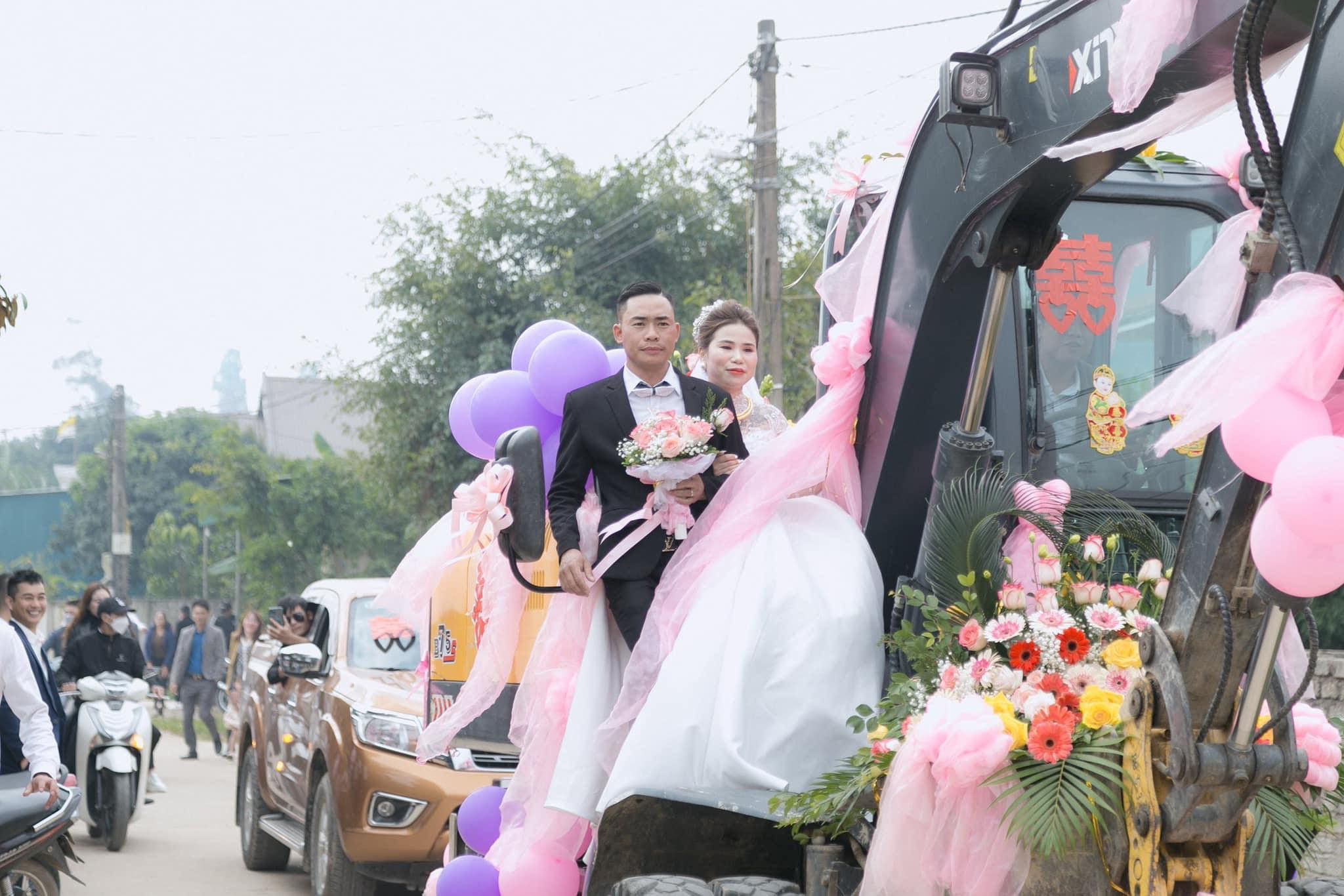 Ở địa phương, gia đình của cô dâu chú rể cũng thuộc diện khá giả. Hai nhà chỉ cách nhau 2km nên rước dâu bằng xe máy xúc rất phù hợp. Dù xe hoa di chuyển khá chậm nhưng lễ rước dâu chỉ mất khoảng 10 phút.