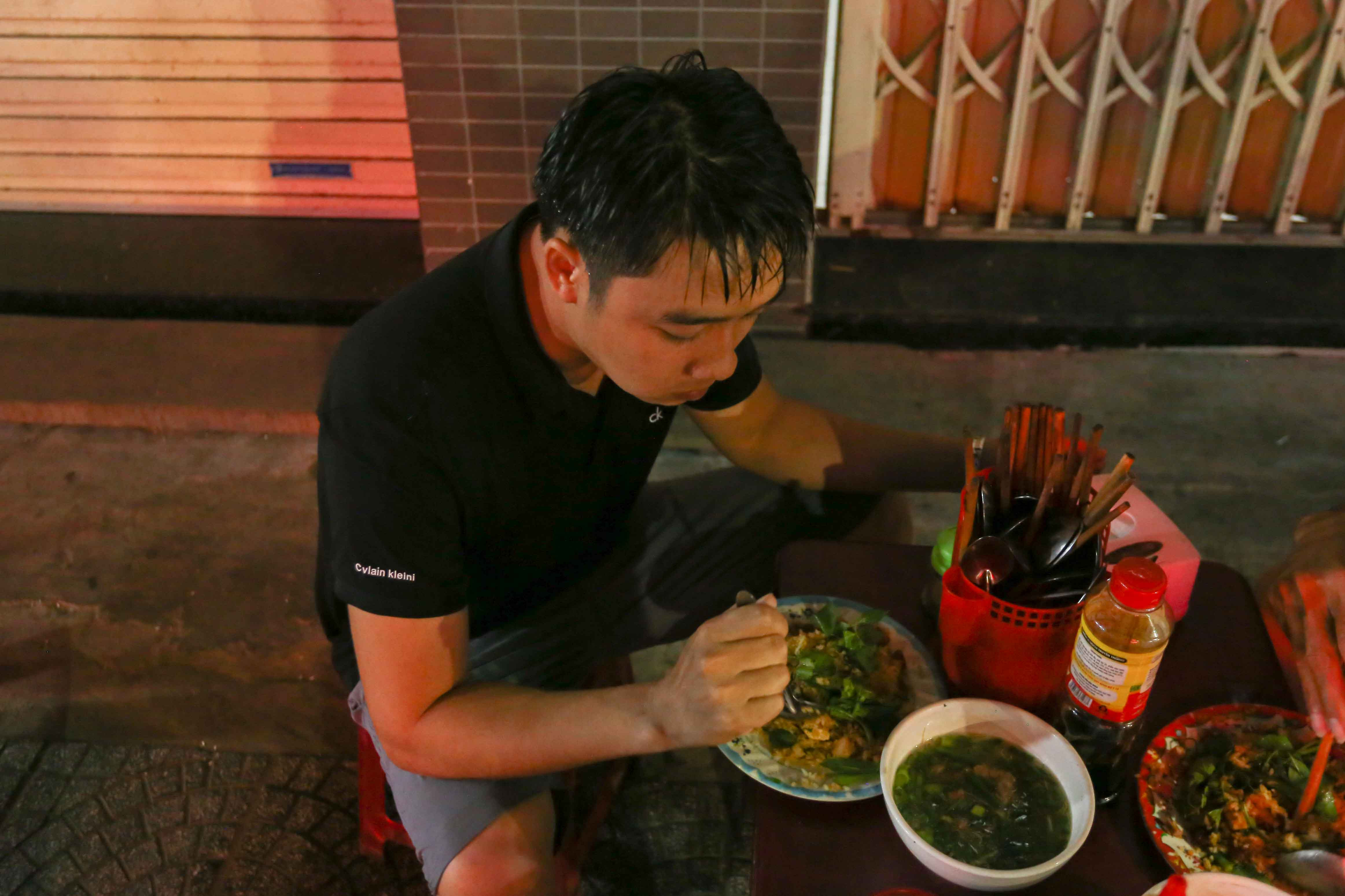 Sau khi cứu người an toàn, anh Đồng trong bộ quần áo ướt sũng vui vẻ quay lại quán cùng bạn ăn bữa tối dang dở.
