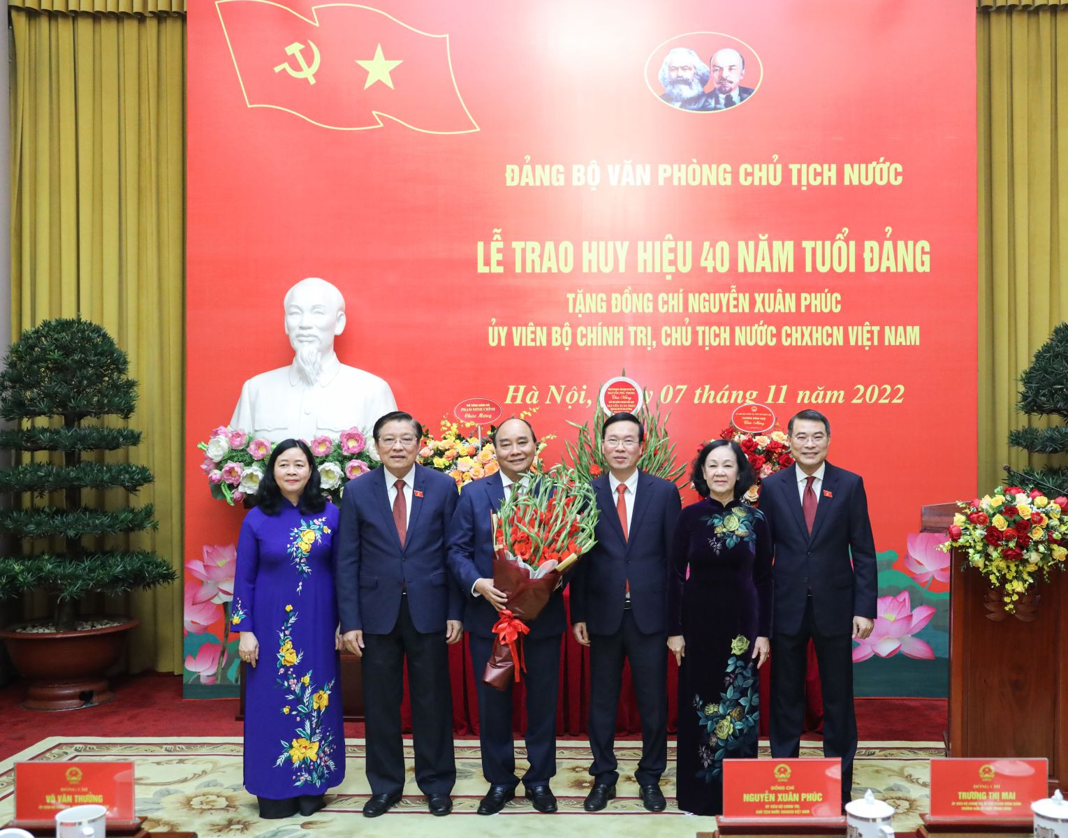 Thay mặt Bộ Chính trị, Ban Bí thư Trung ương Đảng, Thường trực Ban Bí thư Võ Văn Thưởng trân trọng trao huy hiệu 40 năm tuổi Đảng tặng Chủ tịch nước Nguyễn Xuân Phúc.