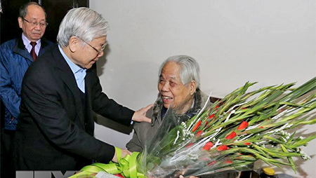 Tổng bí thư Nguyễn Phú Trọng và Chủ tịch nước Trần Đại Quang đến thăm, chúc thọ nguyên Tổng bí thư Đỗ Mười.