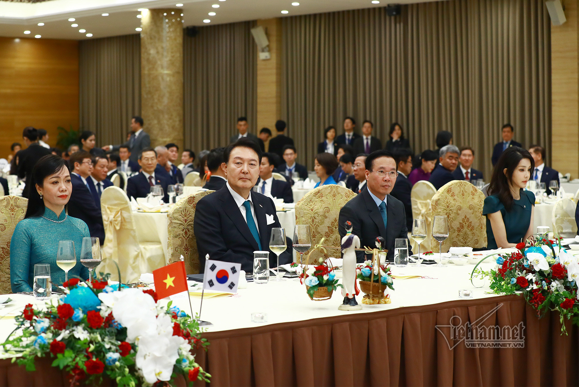 Tối 23/6, tại Trung tâm Hội nghị Quốc tế (Hà Nội), Chủ tịch nước Võ Văn Thưởng và phu nhân Phan Thị Thanh Tâm chủ trì tiệc chiêu đãi trọng thể chào mừng Tổng thống Hàn Quốc Yoon Suk-yeol và phu nhân Kim Keon-hee.