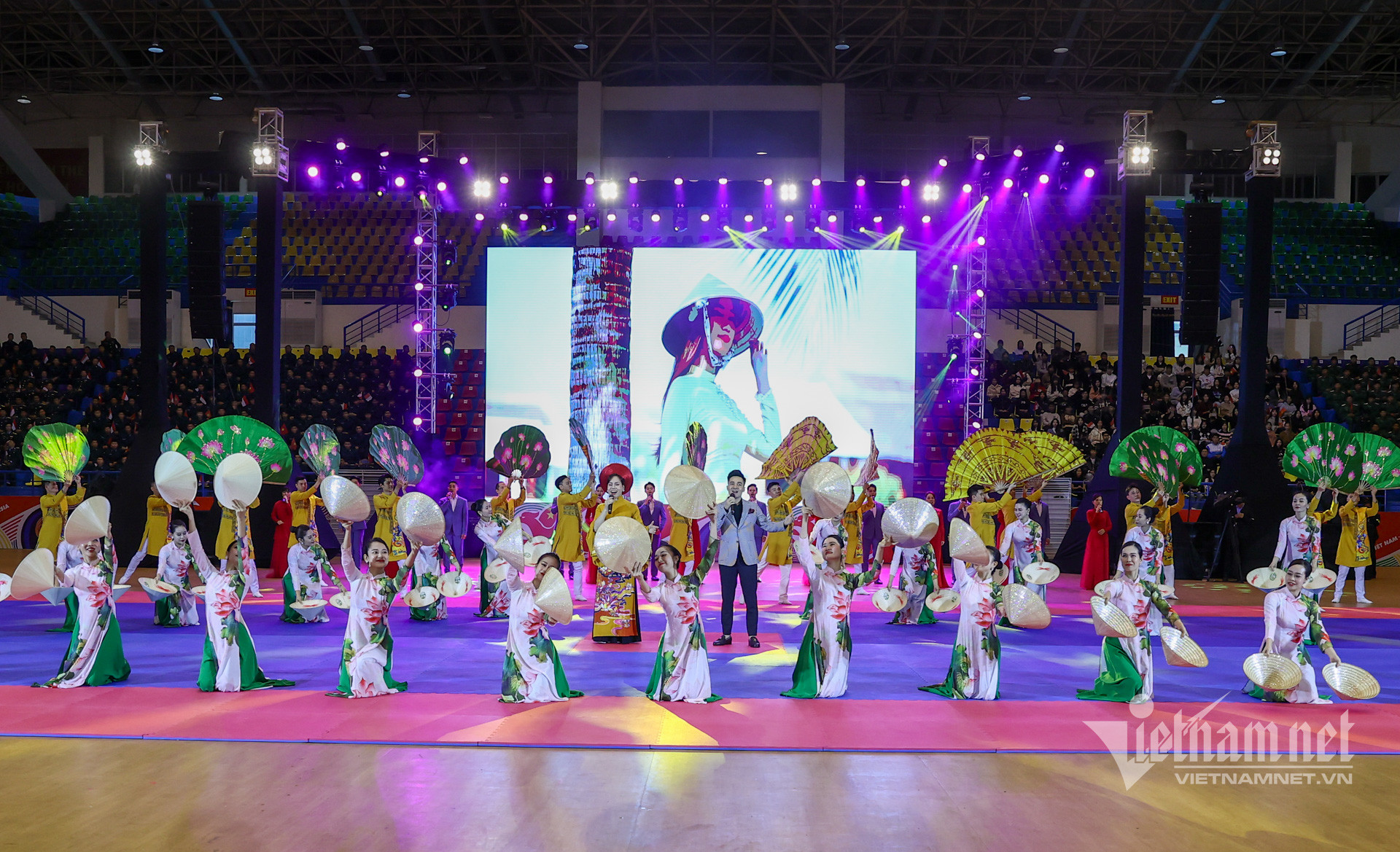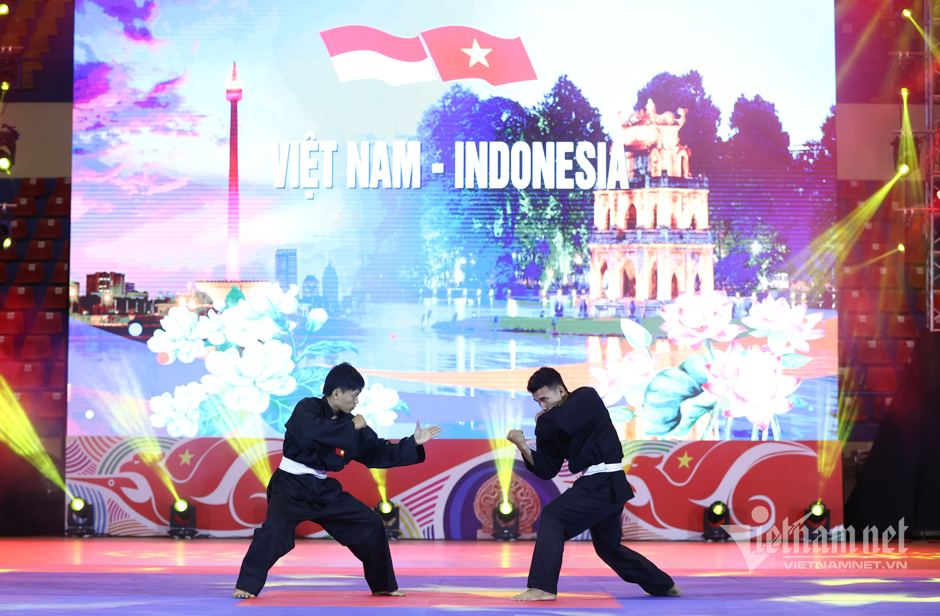Các nghệ sĩ và vận động viên võ thuật Việt Nam trình diễn đẹp mắt các tiết mục đồng diễn, đối kháng, biểu diễn với binh khí hai môn võ cổ truyền. Trên khán đài hai nguyên thủ cùng các đại biểu liên tục dành những tràng pháo tay cổ vũ, động viên.
