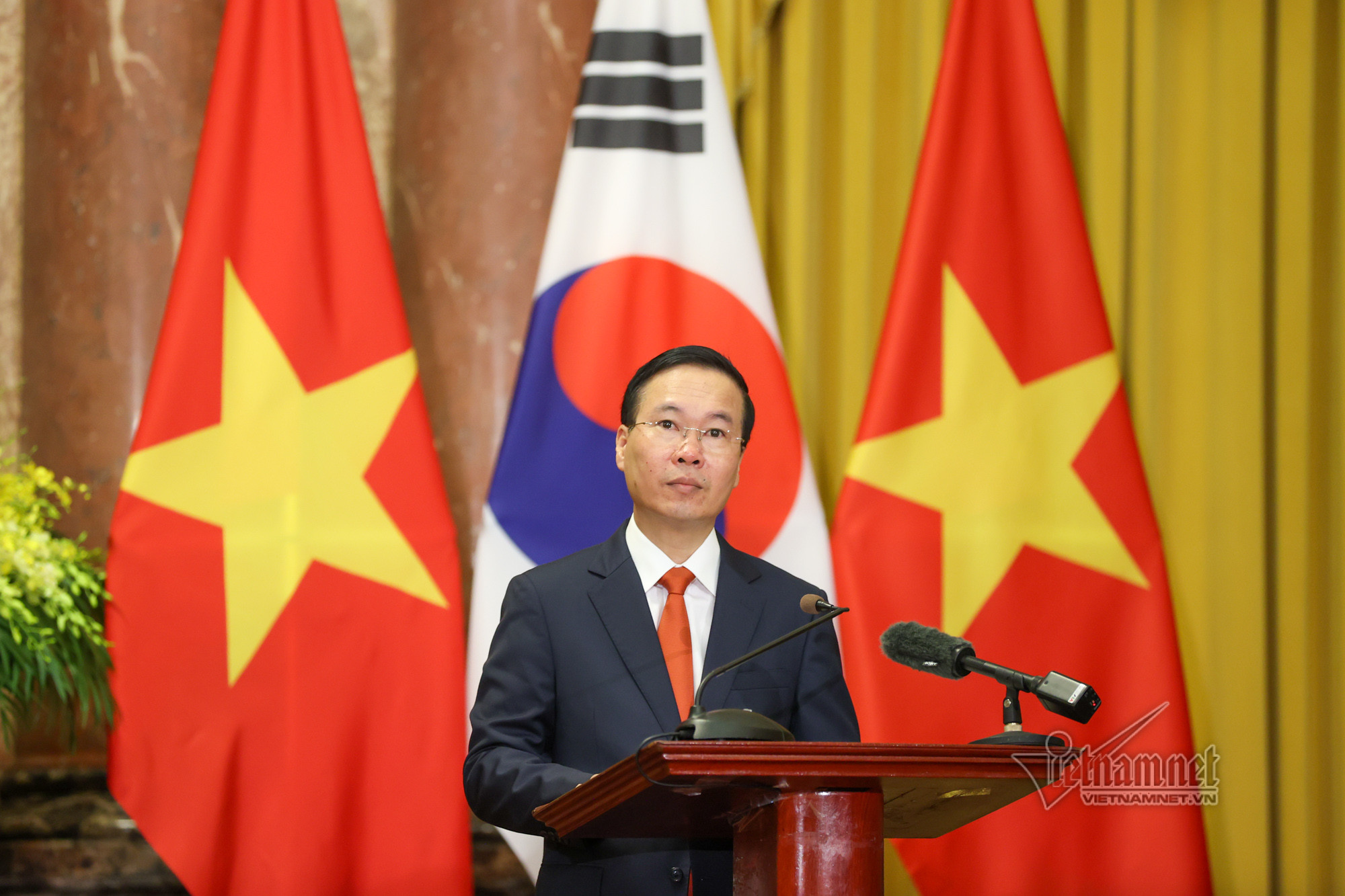 Sáng 23/6, sau lễ đón trọng thể và hội đàm hiệu quả, Chủ tịch nước Võ Văn Thưởng và Tổng thống Hàn Quốc Yoon Suk-yeol đã gặp gỡ báo chí để thông báo về kết quả hội đàm.