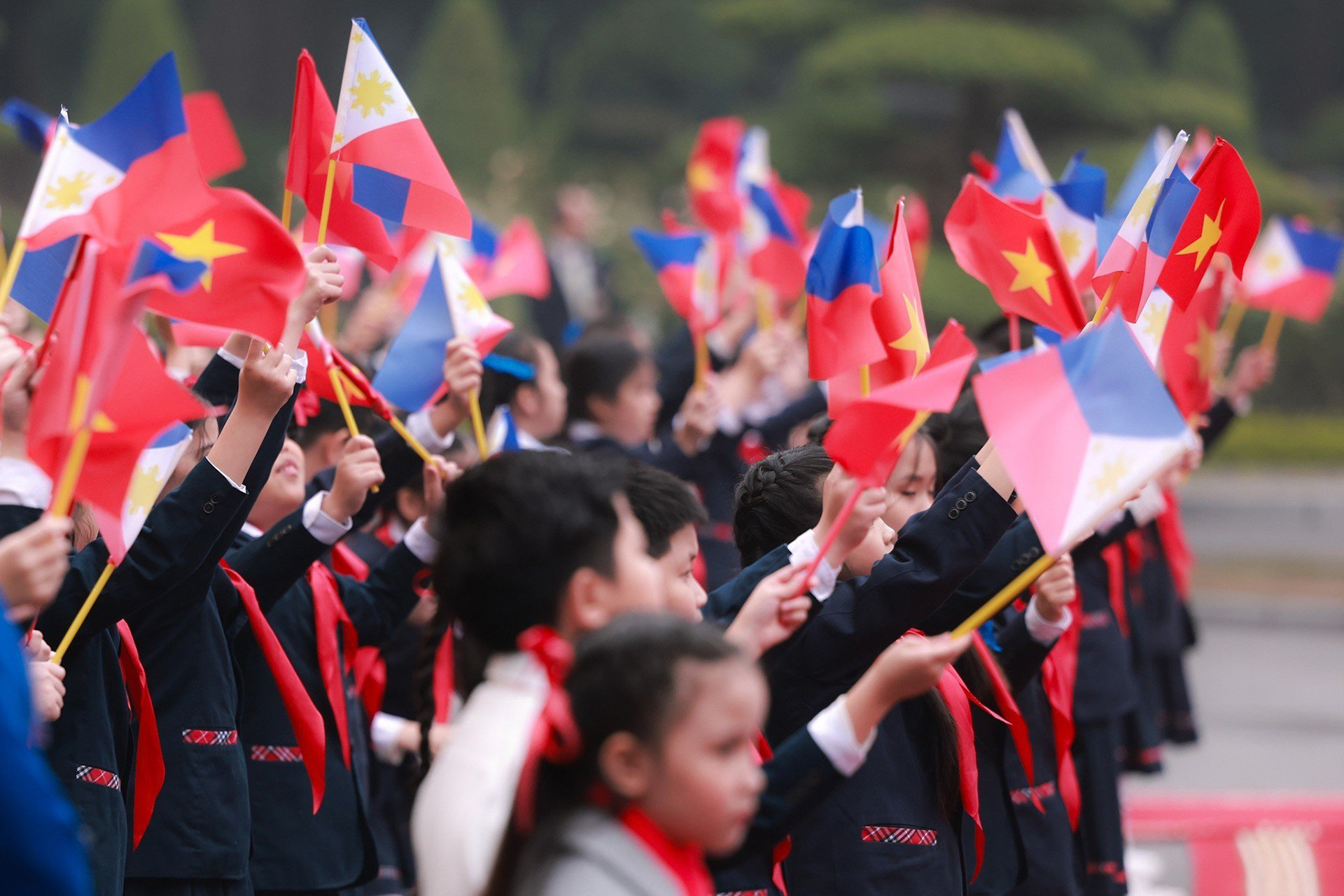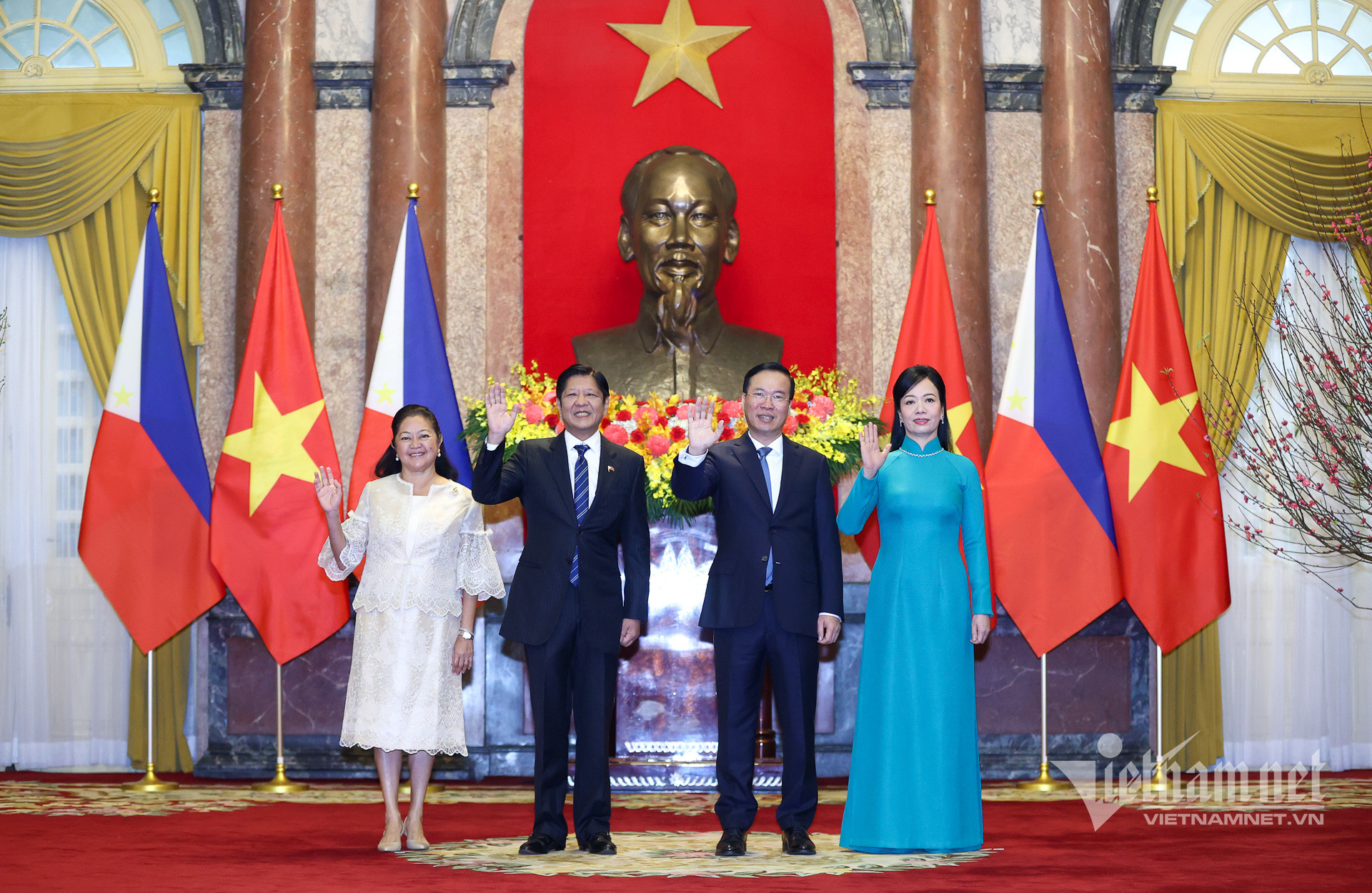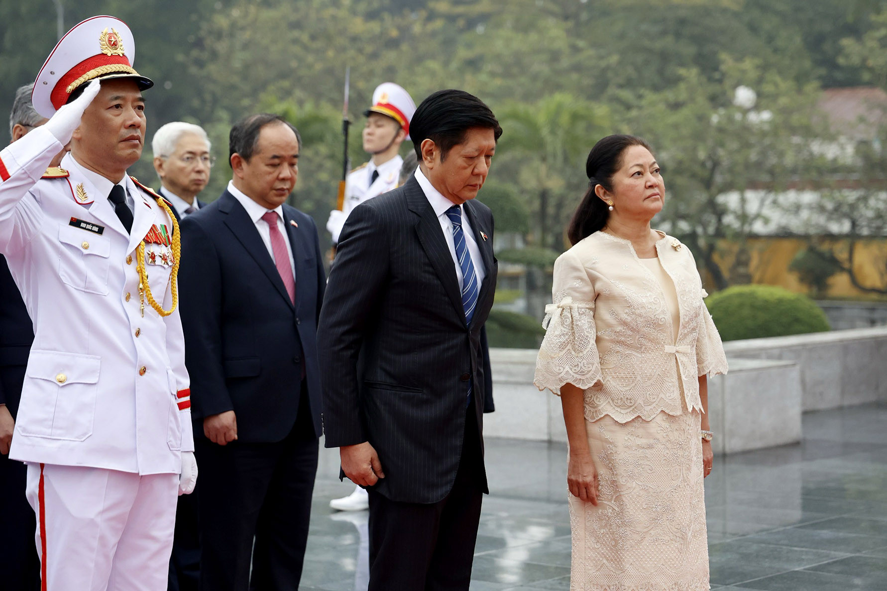 Trong tiếng nhạc chào mừng, Chủ tịch nước Võ Văn Thưởng mời Tổng thống Ferdinand Romualdez Marcos Jr. bước lên bục danh dự, Quân nhạc cử Quốc thiều hai nước.