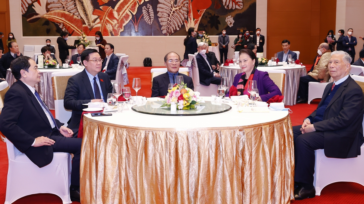 Chủ tịch Quốc hội Vương Đình Huệ chủ trì cuộc gặp mặt, cùng dự có nguyên Chủ tịch Quốc hội Nguyễn Sinh Hùng, nguyên Chủ tịch Quốc hội Nguyễn Thị Kim Ngân.