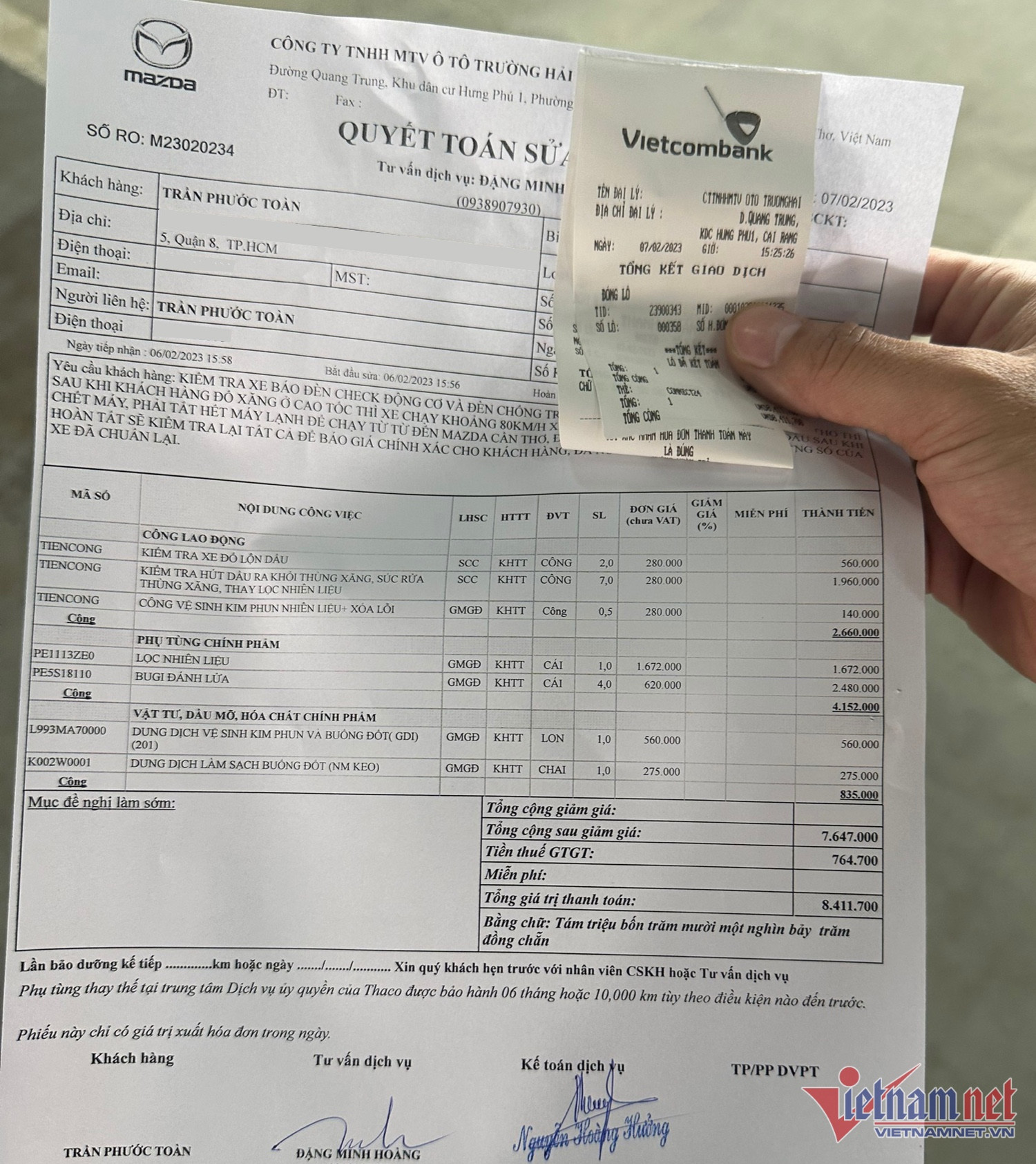 Chiếc Mazda CX-8 của anh phải để lại xưởng gần 2 ngày để xúc rửa bình xăng, thay lọc nhiên liệu, thay bu-gi, vệ sinh kim phun,... tổng chi phí hết hơn 8,4 triệu đồng chưa kể tiền nhiên liệu phải đổ thêm.