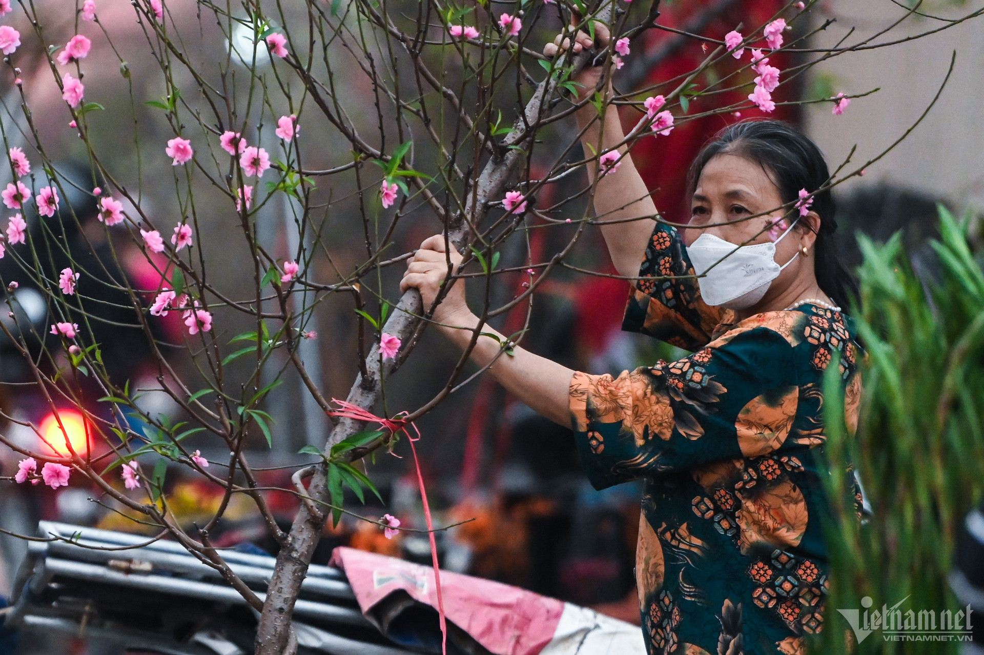 Trong ảnh, một nam tiểu thương ra giá 250.000 đồng cho cành đào bích loại nhỡ liền bị nữ khách hàng trả lại, không mặc cả một câu.