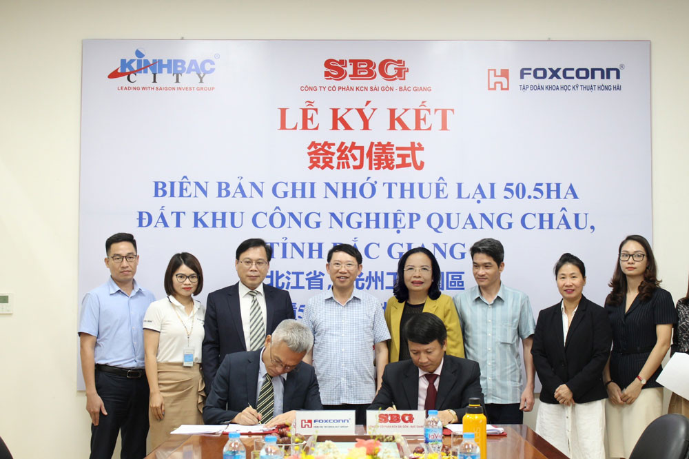 Tổng Công ty Phát triển Đô thị Kinh Bắc (KBC) của ông Đặng Thành Tâm vừa phát đi thông báo cho biết, hôm 15/8 CTCP Khu Công nghiệp Sài Gòn - Bắc Giang (SBG), một công ty con của KBC, đã ký biên bản ghi nhớ về việc thuê lại 50,5 ha đất tại KCN Quang Châu, tỉnh Bắc Giang cho Tập đoàn Foxconn.