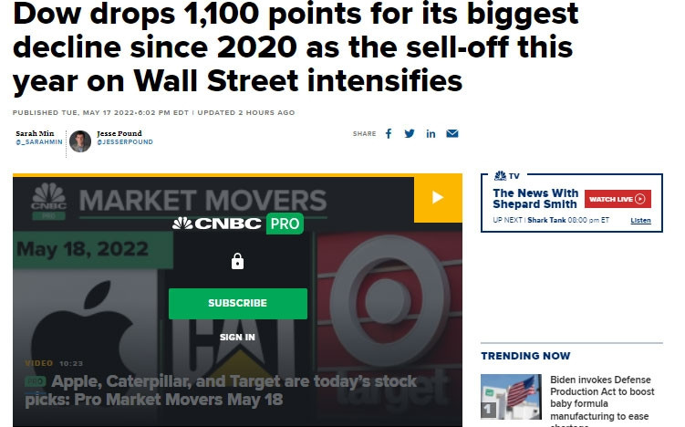 Fed phát tín hiệu tăng mạnh lãi suất để chống lạm phát đang ở mức cao nhất 40 năm. Tuy nhiên, chứng khoán Mỹ bắt đầu sụt mạnh.