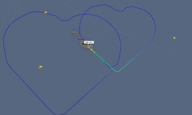 Máy bay chở cặp đôi mới cưới là phi công và tiếp viên của hãng hàng không Malta bay thành hình hai trái tim lồng vào nhau quanh hòn đảo trên biển Địa Trung Hải.