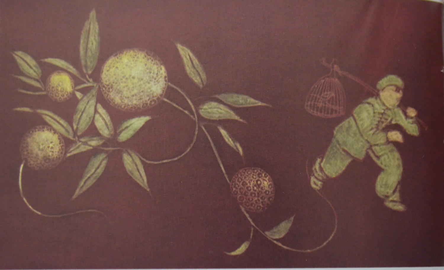 Trịnh Hữu Ngọc chỉ dùng một chút vàng, bạc cho phần dây hoa trang trí chạy viền quanh bức tranh. Toàn bộ hình người và hoa lá đều được chạm khắc rồi dạm màu nhẹ nhàng.