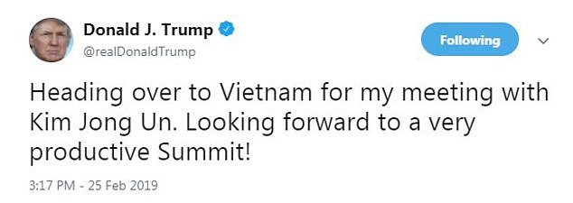 Vào 0h17p ngày 26/2, Tổng thống Mỹ Donald Trump tuyên bố lên đường đến Việt Nam để gặp lãnh đạo Triều Tiên Kim Jong Un và bày tỏ mong chờ về “cuộc họp thượng đỉnh hiệu quả”. Tối nay, chuyên cơ của Tổng thống Trump sẽ hạ cánh xuống sân bay quốc tế Nội Bài trong khi đoàn tàu bọc thép chở Chủ tịch Kim Jong Un đã đến Việt Nam vào sáng cùng ngày.