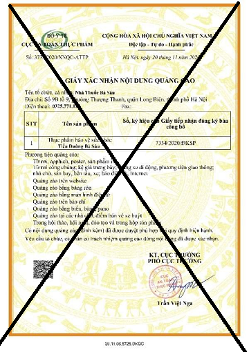 Cục An toàn thực phẩm khẳng định không cấp Giấy tiếp nhận đăng ký bản công bố sản phẩm số 7335/2020/ĐKSP ngày 7/8/2020 và Giấy xác nhận nội dung quảng cáo số 3735/2020/XNQC-ATTP ngày 20/11/2020 cho sản phẩm Tiểu đường Bà Sáu của Nhà thuốc Bà Sáu (địa chỉ: Số 9B tổ 9, phường Thượng Thanh, quận Long Biên, Hà Nội).