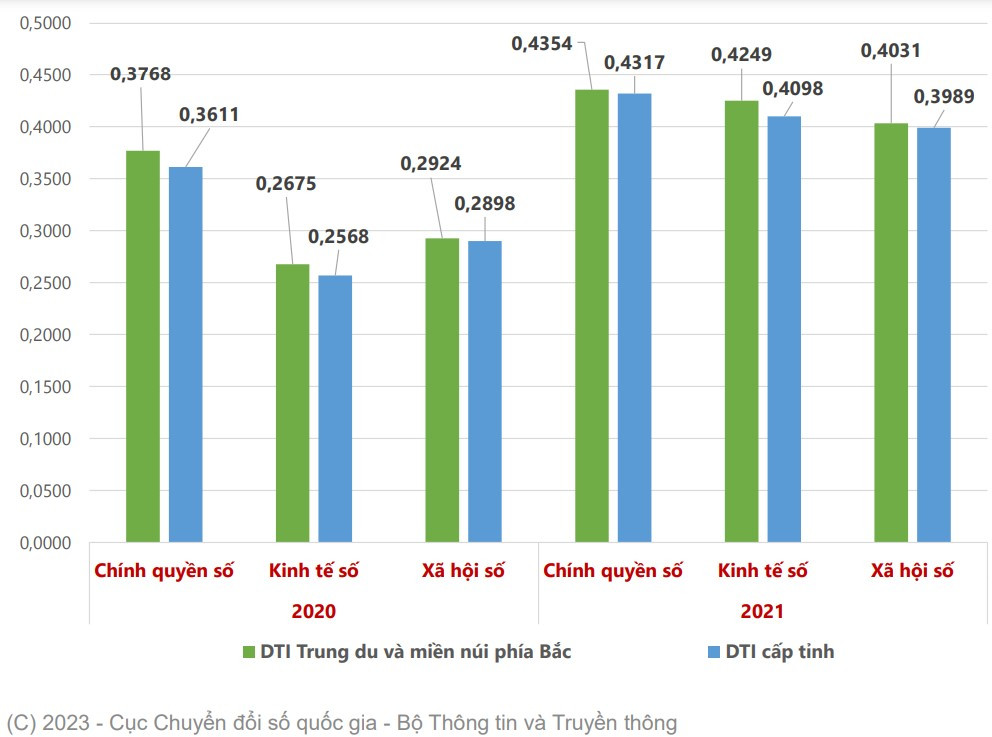Đối với khu vực trung du và miền núi phía Bắc, trong 2 năm 2020-2021, số liệu của Cục Chuyển đổi số Quốc gia ghi nhận, giá trị trung bình Bộ Chỉ số đánh giá chuyển đổi số (DTI) của khu vực này cao hơn trung bình cả nước. Theo đó, chỉ số DTI của khu vực trung du và miền núi phía Bắc năm 2020 cao hơn giá trị trung bình cả nước là 0,016 và năm 2021 là 0,0069.