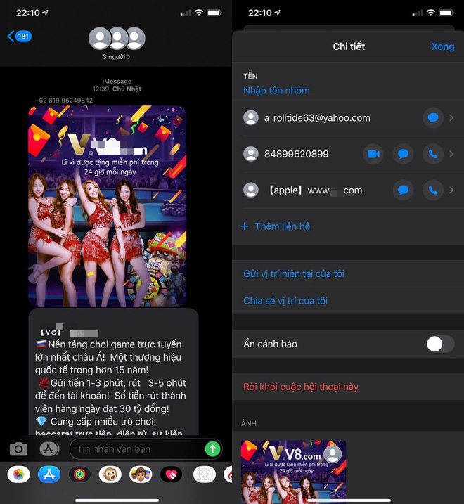 Tuy nhiên mới đây, những trang cá độ này lại có một hình thức tiếp cận tuy mới mà cũ: gửi tin nhắn. Được biết rằng đã có rất nhiều người dùng iPhone sử dụng tính năng iMessage và đã nhận được tin nhắn với nội dung quảng cáo web cá độ. Không chỉ vậy, họ còn tự động bị thêm vào các nhóm iMessage cũng với mục đích trên.