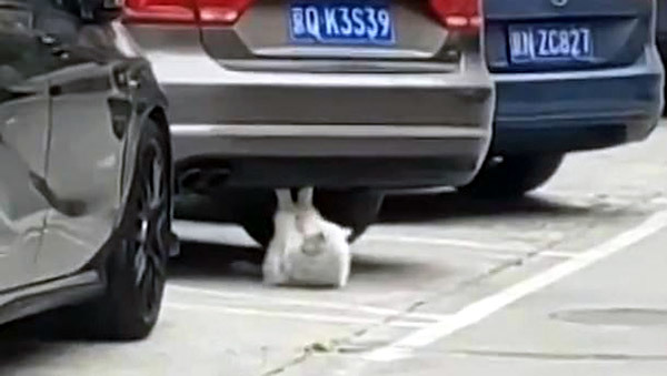 Người xem vô cùng sửng sốt khi chứng kiến cảnh một con mèo trắng tập gập bụng điêu luyện như người ở phía dưới một chiếc xe hơi trong bãi đỗ.