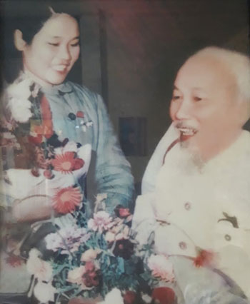 | Năm 1967, bà Nguyễn Thị Kim Huế vinh dự được gặp Bác và tặng hoa cho Bác. |
