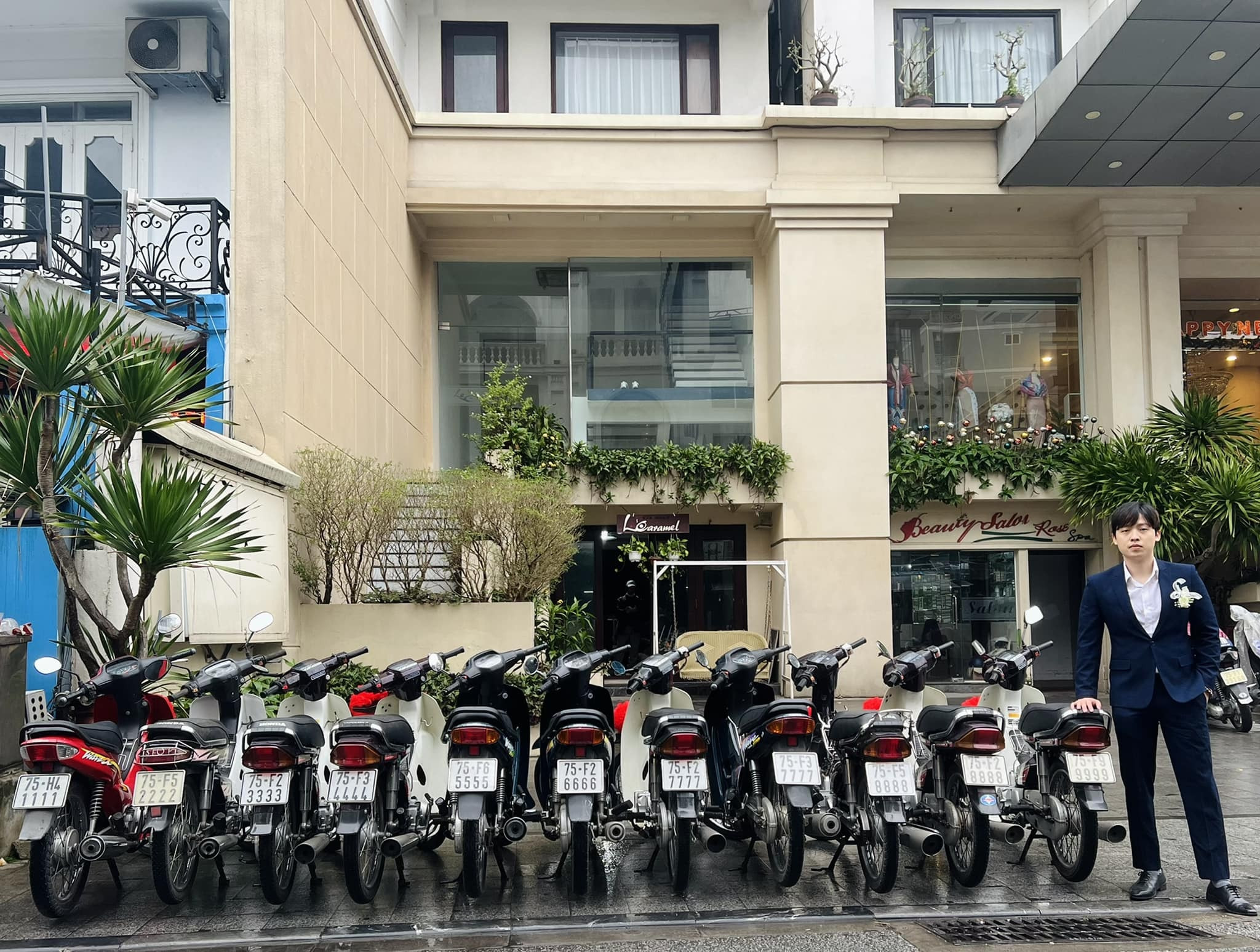 Dàn xe rước dâu là 11 chiếc xe máy Dream Thái và xe Wave có biển tứ quý lần lượt từ 1 tới 9 do chú rể Quang Huy cất công sưu tầm trong 2 năm qua.