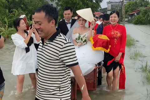 Trong hầu hết các đám cưới, màn rước dâu thường có sự góp vui của đông đảo quan viên hai họ. Tuy nhiên, như trong đoạn video ghi lại, màn rước dâu này chỉ có cô dâu, chú rể đưa nhau qua dòng nước ngập. Khoảnh khắc khiến nhiều người dùng mạng tò mò, để lại bình luận thắc mắc: