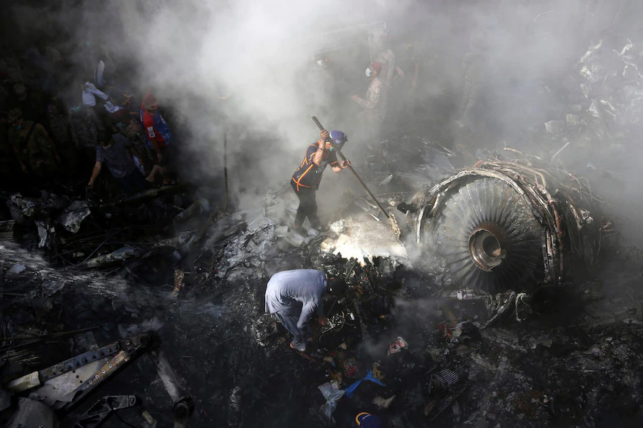 Hiện trường rơi máy bay chở khách Airbus A320 của hãng PIA vào ngày 22/5/2020. Ảnh: AP