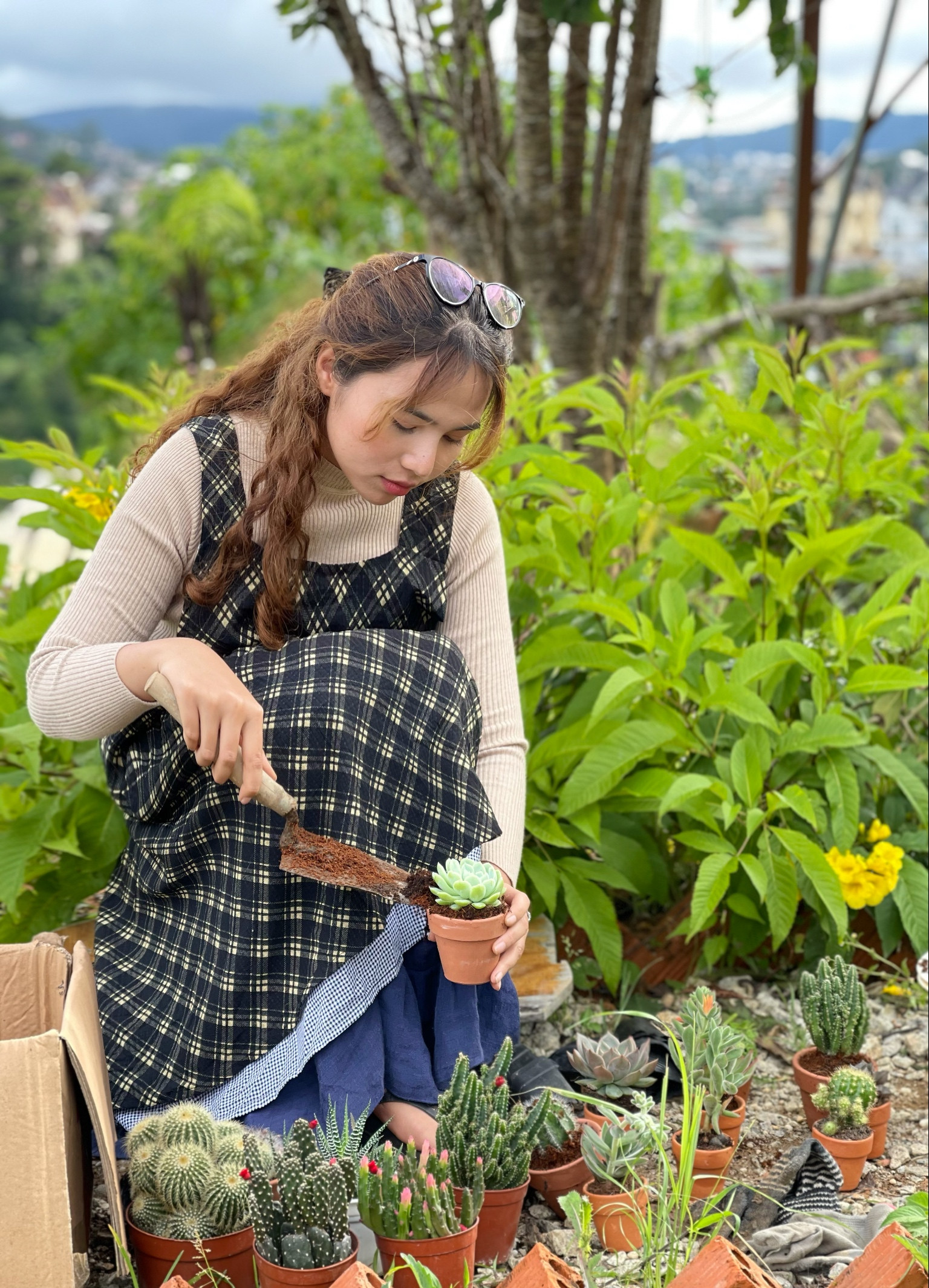Khác với hình ảnh một quản lý cửa hàng trang sức tại TP.HCM chỉn chu trong bộ vest, đeo giày cao gót, trang điểm cầu kì, sau thời gian "bỏ phố về Đà Lạt" hỗ trợ chồng kinh doanh homestay, quán cà phê, Tường Ny (27 tuổi) đã... quen với việc làm "nông dân". Cô sẵn sàng cùng chồng cuốc đất trồng hoa, chăm vườn, sơn sửa đồ nội thất...