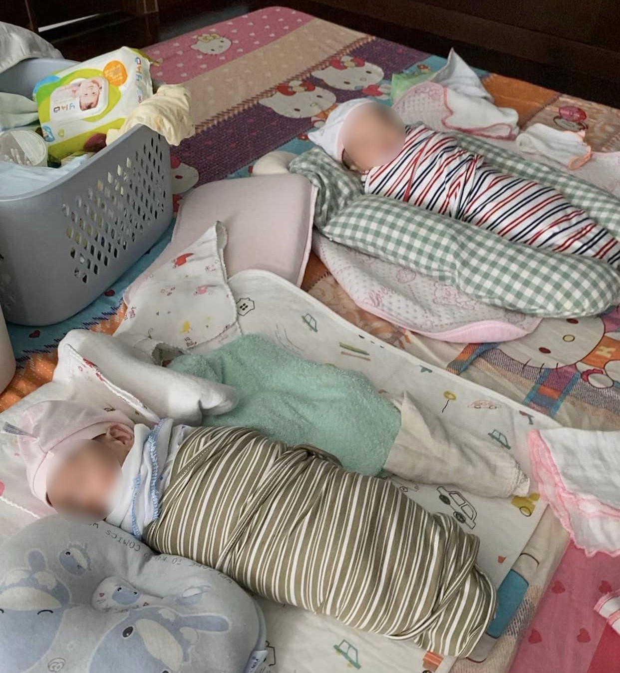 Do sinh non, lại bị bỏ rơi ngoài trời lạnh, nên hai bé hắt hơi, sổ mũi liên tục, chị Nga cùng người giúp việc thay phiên chăm sóc. Nhà hàng xóm có phụ nữ vừa sinh con, chị sang xin mấy túi sữa mẹ, bón cho hai cháu.