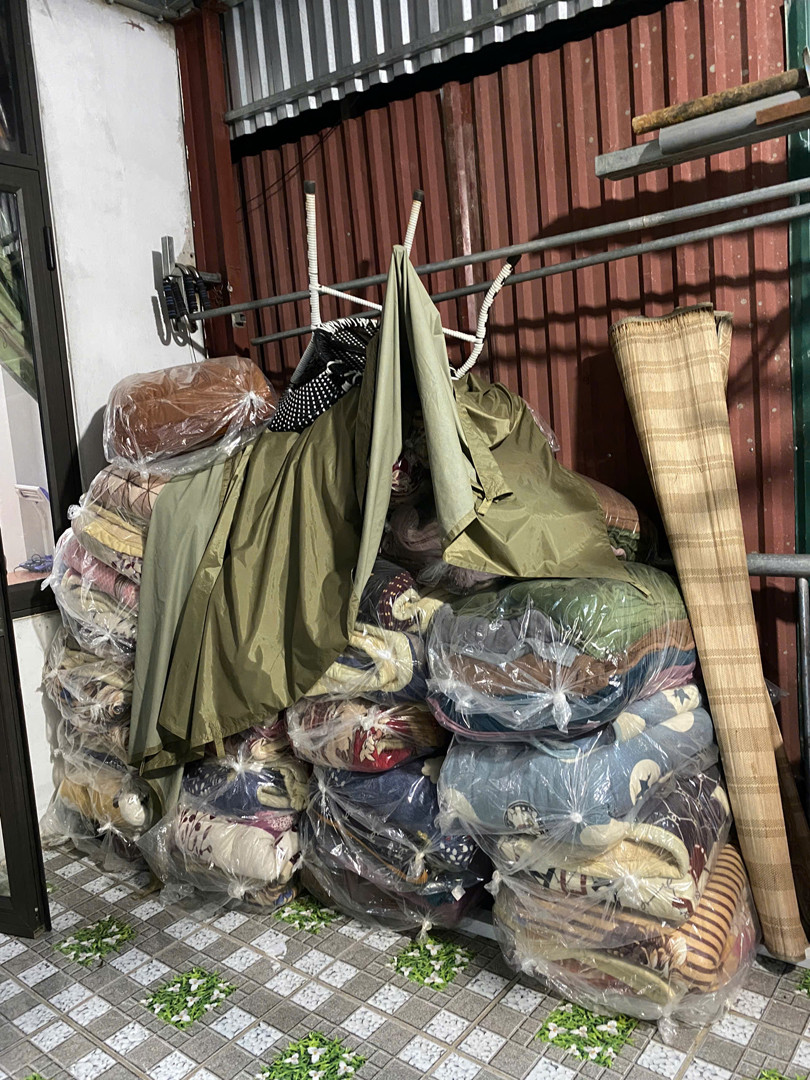 Nhà cô là tiệm giặt là nên có sẵn thiết bị di chuyển vật nặng. Bố mẹ cô sắm thêm giá sắt đựng đồ, dây chằng, túi nilon lớn,...