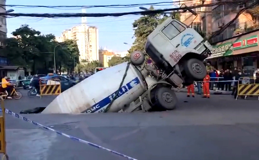 Xe trộn bê tông bị hố tử thần 'khổng lồ' nuốt chửng