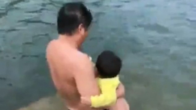 Clip cho thấy cậu bé sợ hãi và khóc thét khi bị bố bế ra khỏi bờ, trong khi ông bố và một số người lớn trên bờ cười sảng khoái. Bất chấp sự sợ hãi của con trai, ông bố vẫn ném con xuống nước và để cho cậu bé tự tìm cách vào bờ.