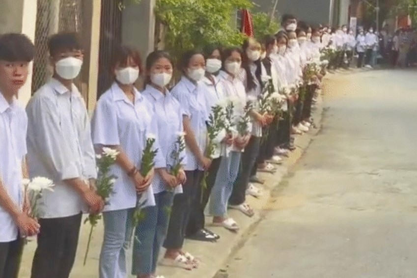 Theo anh Quân, hàng trăm học sinh cầm hoa cúc trắng, xếp hai hàng dài đến 1km từ đầu ngõ đường An Sơn về đến nhà cô giáo. Một số học sinh còn xếp hàng đứng tiễn cô đến tận nghĩa trang.