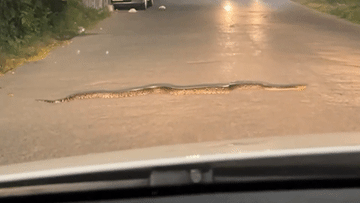 Các tài xế đều cho xe dừng lại để nhường chỗ cho một con trăn "khổng lồ" đang bò qua đường.