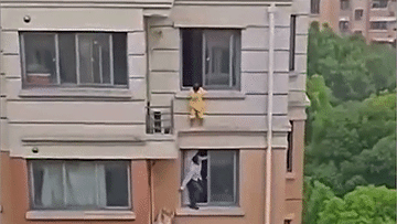 Thấy cháu bé chới với sắp rơi từ tầng 2, người đàn ông lao nhanh tới đón đỡ đứa trẻ ngã xuống trong tích tắc.