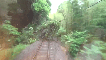 Những du khách đã thét lên kinh hãi khi đoàn tàu chở họ đâm trúng cây đổ chắn ngang đường ray ở Nhật Bản.