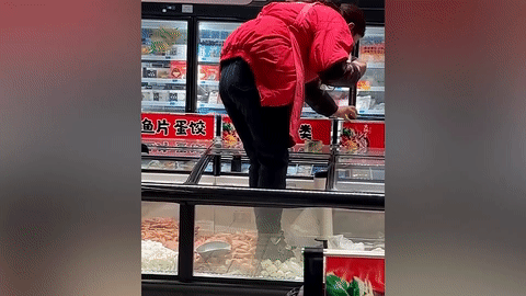 Video được một khách hàng đã ghi lại thời điểm nữ nhân viên siêu thị trèo vào trong tủ mát và liên tục ‘giẫm đạp’ lên thực phẩm.