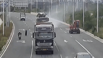Chiếc xe tải bất ngờ bung 2 lốp, văng trúng một người đàn ông đang đi xe máy khiến người này ngã sõng soài trên xa lộ