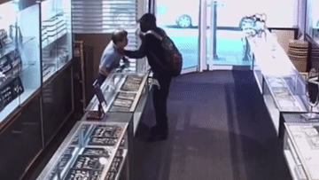 Tên cướp rút súng lục, tấn công một chủ tiệm vàng cho đến khi người này gục xuống sàn, trước khi lấy đi nhiều đồ trang sức quý giá.