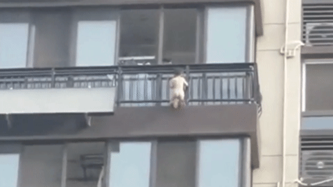 Khoảnh khắc em bé đứng bám ngoài ban công tầng 5 gây sốc
