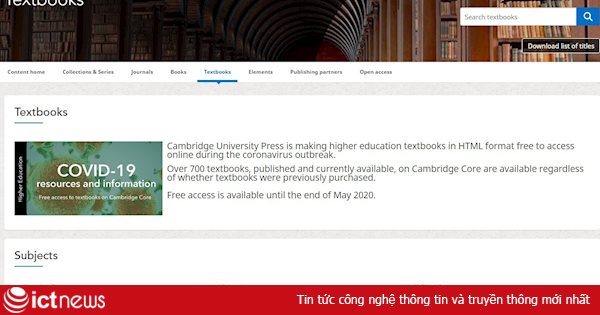 Nhà xuất bản ĐH Cambridge (ĐH Cambridge) sẽ mở kho giáo trình trực tuyến miễn phí đến cuối tháng 5/2020. Đây là cơ hội hiếm có cho những ai muốn tham khảo các nguồn học liệu uy tín và hữu ích.