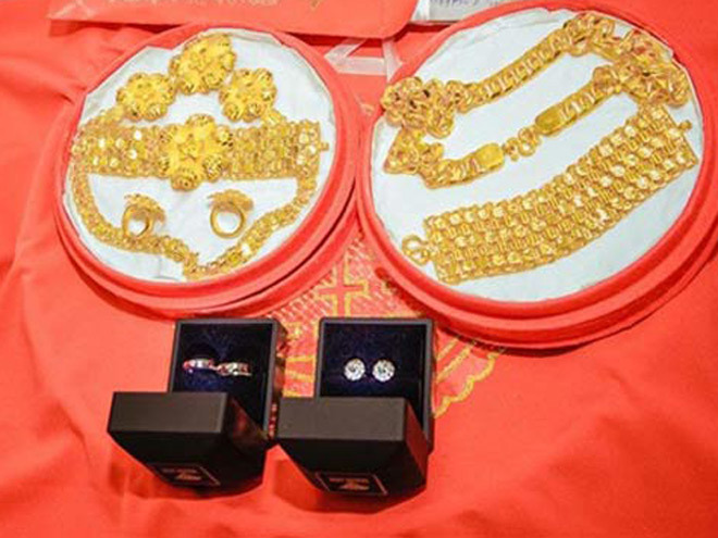 Mới đây, dân mạng lại truyền tay nhau hình ảnh và clip về một đám hỏi hoành tráng ở Kiên Giang. Cô dâu nhận được sính lễ khoảng 13 cây vàng được thiết kế thành nhẫn, dây chuyền, vòng tay… cùng với đó là rất nhiều trang sức khác và số tiền mặt lên tới gần 1 tỷ đồng.