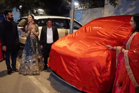 Cặp vợ chồng Ấn Độ giấu món quà bí mật cho bố chồng bên ngoài sảnh tiệc cưới. Ảnh: Lakhneet Vlogs. |