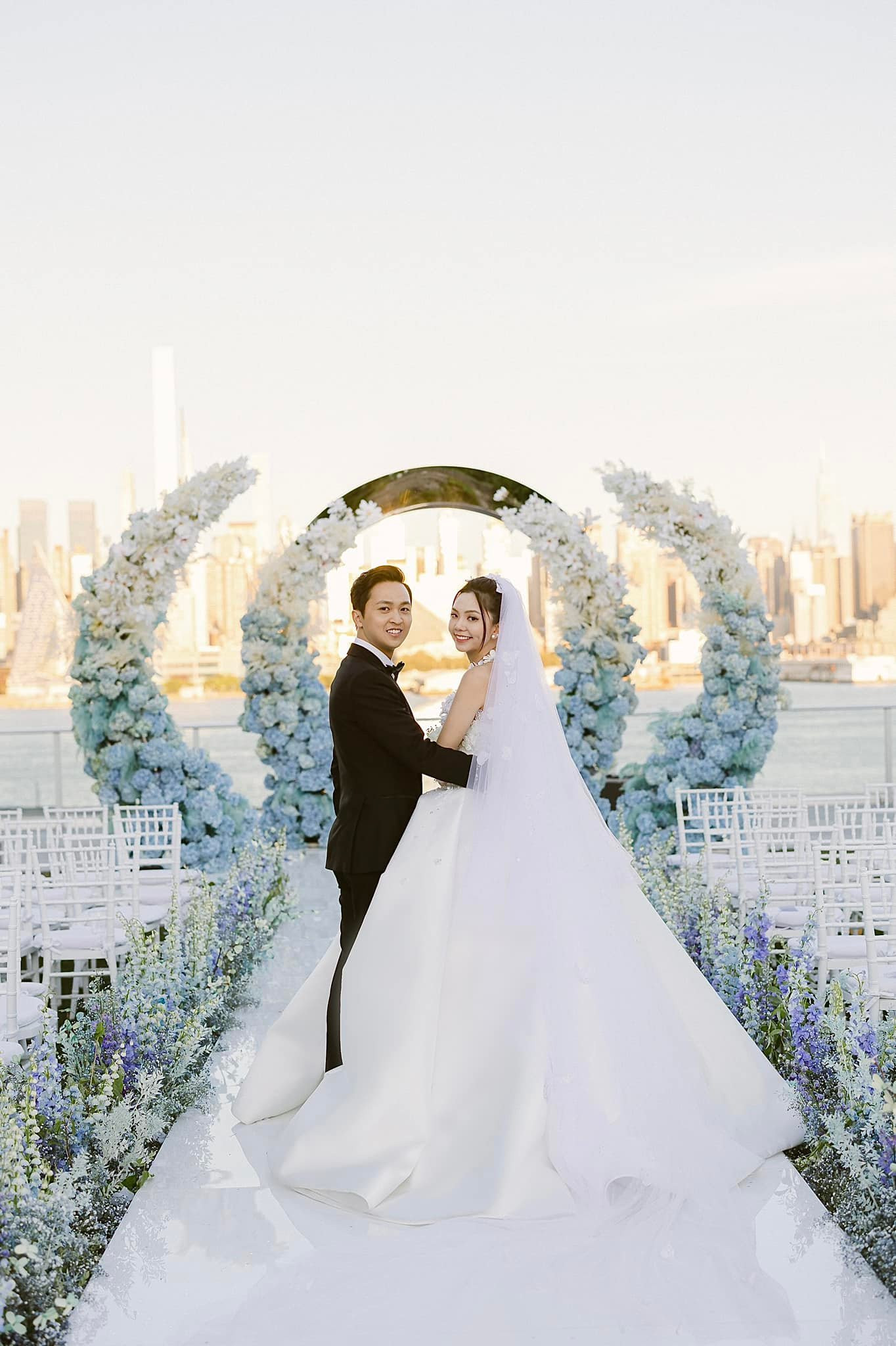 Lễ cưới được tổ chức ở ngoài trời, tại một nhà hàng nổi tiếng New York, nơi có thể nhìn thấy một phần thành phố sầm uất nhưng thơ mộng. Với chủ đề "bầu trời" thể hiện cá tính yêu tự do, thiên nhiên của cô dâu, chú rể, lễ cưới trang hoàng bằng bảng màu chủ yếu xanh lam, kem, xám và trắng.