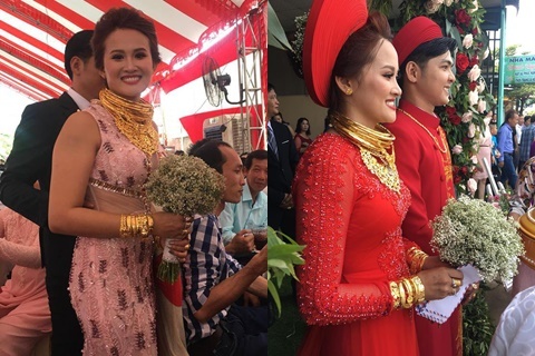 Hiện nay, nhiều đôi trẻ không ngần ngại chi mạnh tay, thể hiện sự xa hoa, đẳng cấp của mình trong ngày trọng đại. Mới đây nhất, dân mạng chú ý và liên tục chia sẻ hình ảnh một cô dâu "ngập vàng" tại Đồng Nai.