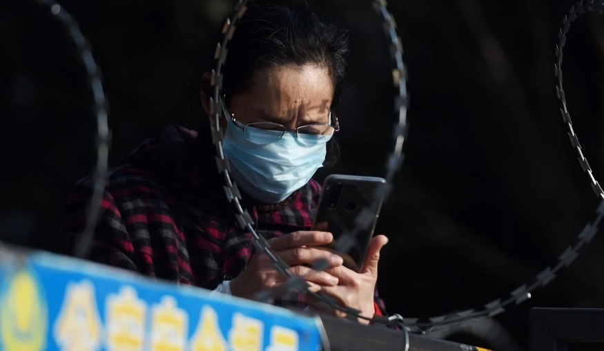 | Một phụ nữ sử dụng điện thoại di động sau hàng rào thép gai ở lối vào một khu dân cư ở Vũ Hán – tâm chấn của đợt bùng phát đại dịch Covid-19. Ảnh: Reuters |