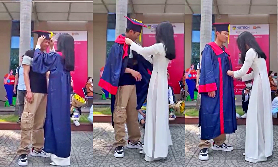 Đến trước mặt anh trai, cô gái 23 tuổi cởi mũ, bộ quần áo cử nhân rồi mặc nó lên người anh. Thảo muốn tri ân anh trai, người đã hi sinh tuổi thanh xuân, thay bố mẹ nuôi cô ăn học, trưởng thành như bây giờ.