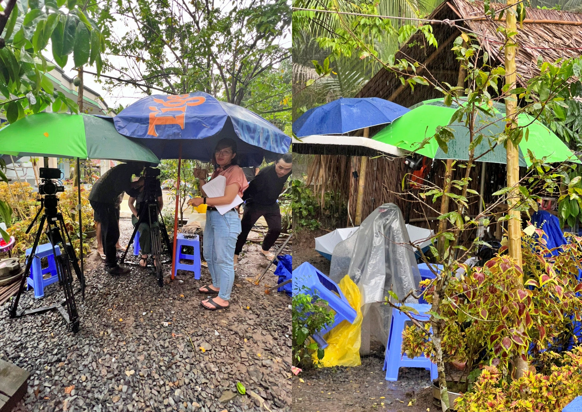 Lắm lúc, mọi người vừa sắp đặt đâu vào đó và chuẩn bị quay phim thì mưa bất chợt ào đến. Thế là, cả đoàn và gia đình Trang lật đật tìm áo mưa, bạt nhựa che lại.